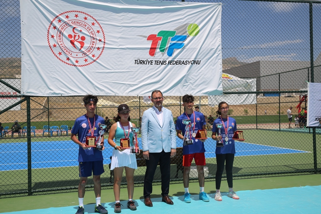 Üniversitemizin ev sahipliğinde 14 ilden 139 sporcunun katılımıyla düzenlenen 'Cudi Cup Ulusal Tenis Turnuvası final müsabakası Gençlik ve Spor Bakanı Mehmet Muharrem Kasapoğlu'nun katılımıyla yapıldı. Bakan Kasapoğlu, beraberindeki Şırnak Valisi Ali Hamza Pehlivan, AK Parti Milletvekili Rizgin Birlik, Belediye Başkanı Mehmet Yarka, Türkiye Tenis Federasyonu Başkanı Cengiz Durmuş, Üniversitemiz Rektörü Prof. Dr. Mehmet Emin Erkan Jandarma Bölge Komutanı Tuğgeneral Ali İhsan Ersoy, İl Jandarma Komutanı Kıdemli Albay Tamer Bilacan, Cumhuriyet Başsavcısı Orhan Al ve İl Emniyet Müdürü Mustafa Emre Başbuğ ile Gençlik ve Spor İl Müdürü Beytullah Birlik’in katılımıyla Üniversitemiz yerleşkesinde bulunan, Cudi Dağı manzaralı 2'si kapalı, 2'si açık, 4 tenis kortunda mücadele eden sporcularla bir araya gelerek sporculara başarılar diledi.'Uluslararası kupayı da geliştireceğiz'Cudi Cup Ulusal Tenis Turnuvası'na ilişkin yapılan törende konuşan Gençlik ve Spor Bakanı Mehmet Muharrem Kasapoğlu, ülkenin standartlarının yükselmesi için tüm imkanların seferber edildiğini ifade etti. Ülkenin her bir ferdinin kendileri için çok değerli olduğunu belirten Kasapoğlu, istişare ile karar verdikleri çalışmaları birer birer gerçekleştirerek hedeflerine ulaşmanın sevincini yaşadıklarını ifade etti. Bakan Kasapoğlu, Şırnak'ta, Şırnak'ın ilçeleri ve köylerinde sporun geliştiğini, sporcuların yetiştiğini, gençlerin kendisini geliştirmeye yönelik her türlü imkanla buluştuğunu görmekten mutluluk duyduğunu dile getirerek, "Bugün ulusal bir kupa var ama inşallah uluslararasını da gerçekleştireceğiz. Şırnak buna en güzel şekilde ev sahipliği yapar, buna inanıyoruz. Tenisiyle, atletizmiyle, cimnastiğiyle sporun her branşını en güçlü şekilde temsil etme adına Şırnak ve ilçelerinin aynı zamanda bir spor şehri olarak bu yolda hızlı şekilde ilerlemesi ayrı bir mutluluk kaynağı." şeklinde konuştu. Durmuş: "Her zaman gençlerimizin, çocuklarımızın emrinde olacağız"TTF Başkanı Cengiz Durmuş da sadece turnuva yapmanın yetmediğini bildiklerini belirterek, bu turnuvalarda oynayacak sporculara da ihtiyaç olduğunu söyledi. Durmuş "Sayın Cumhurbaşkanımızın, Sayın Bakanımızın bize yüklemiş olduğu hedefler doğrultusunda sporun tabana yayılması lazımdı. Sayın Bakanımız, bizi buralara, sporu tabana yayma ilkesi ile görevlendirdiğinde, Şırnak'a geldiğimiz anda bunu gerçekleştireceğimizi konuşmuştuk. Bugün şükürler olsun ki bunu başarmış olarak sizlerin huzurunda bu keyfi yaşamak mutluluk verici."dedi. Vali Pehlivan: "Bu etkinliği, Şırnak'tan, Cudi'den bütün Türkiye'ye, dünyaya güzel haberlerin müjdecisi olarak değerlendiriyoruz"Şırnak Valisi Ali Hamza Pehlivan ise turnuvaya ev sahipliği yapmaktan duydukları memnuniyeti dile getirdi. "Bugün sizlerin desteğiyle yapmış olduğumuz bu etkinliği, Şırnak'tan, Cudi'den bütün Türkiye'ye hatta bütün dünyaya güzel haberlerin müjdecisi olarak değerlendiriyoruz." diyen Pehlivan, Şırnak'a kattıkları değerlerden ve yaptıkları yatırımlardan dolayı Bakan Kasapoğlu'na teşekkür etti.Rektörümüz “Cudi Cup Tenis Turnuvasına ev sahipliği yapmaktan gurur duyuyoruz.” Üniversitemiz Rektörü Prof. Dr. Mehmet Emin Erkan da şehrimizde düzenlenen Cudi Cup Tenis Turnuvasına ev sahipliği yapmaktan gurur duyduğunu ifade ederek, bu tür organizasyonların gençlerimiz için çok önemli olduğunu söyledi.Belediye Başkanı Mehmet Yarka ve AK Parti Şırnak Milletvekili Rizgin Birlik de birer konuşma yaptı. Bakan Kasapoğlu, daha sonra final müsabakasını izledi. Turnuvada erkeklerde birinci Ağrı Gençlik Spor Kulübünden Habip Anak, ikinci aynı kulüpten Mehmet Semih Aslan oldu. Kadınlarda ise birinciliği Mersin Deniz Yelken ve Yüzme Kulübünden Nil Delice, ikinciliği Adıyaman Gençlik ve Spor Kulübünden Ecem Yaren elde etti. Bakan Kasapoğlu, ve Şırnak Valisi Ali Hamza Pehlivan organizasyonun sonunda düzenlenen ödül töreninde dereceye giren sporculara kupa ve madalya takdim etti. Tören, halk oyunları gösterisi ve müzik dinletisi ile sona erdi. Gençlik ve Spor Bakanı Kasapoğlu, törenin ardından Üniversitemiz Yerleşkesinde Valilik, belediye ve üniversitenin katkılarıyla kurulan Şal Şapik Atölyesi'ni gezdi, burada yürütülen çalışmalarla ilgili bilgi aldı.